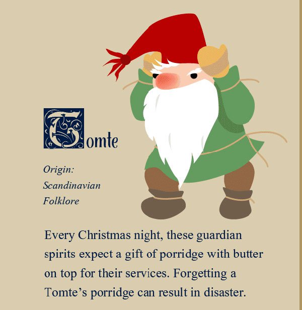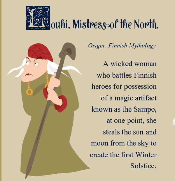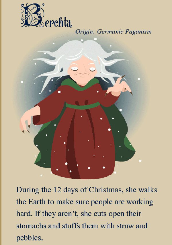 Of course, not all witches that appear at this time of year are good witches. Grýla hails from Icelandic folklore and is more interested in eating children than giving them things to eat. Come Christmas time, Grýla is said to come down from her mountain and seek out naughty children. She gathers them up in a sack and carries them back to her mountain in order to make them into a stew. While the Befana is often a kind-looking witch, Gryhla is truly a hideous-looking one, with horns on her head, many tails, and a very large, wart-covered nose. This is one Christmastime visitor you don't want to see.