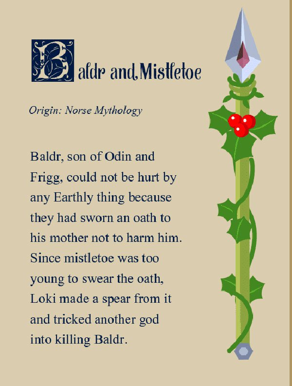 TRUTH: Baldur was the grandson of the Norse god Thor and lived in terror because he believed that every living plant and animal intended to kill him. Cowering in fear, he locked himself in his room. His wife and mother scoured the land and begged all the living things, except mistletoe, to be kind and to leave Baldur alone. They thought that asking mistletoe was pointless because it was so lowly.