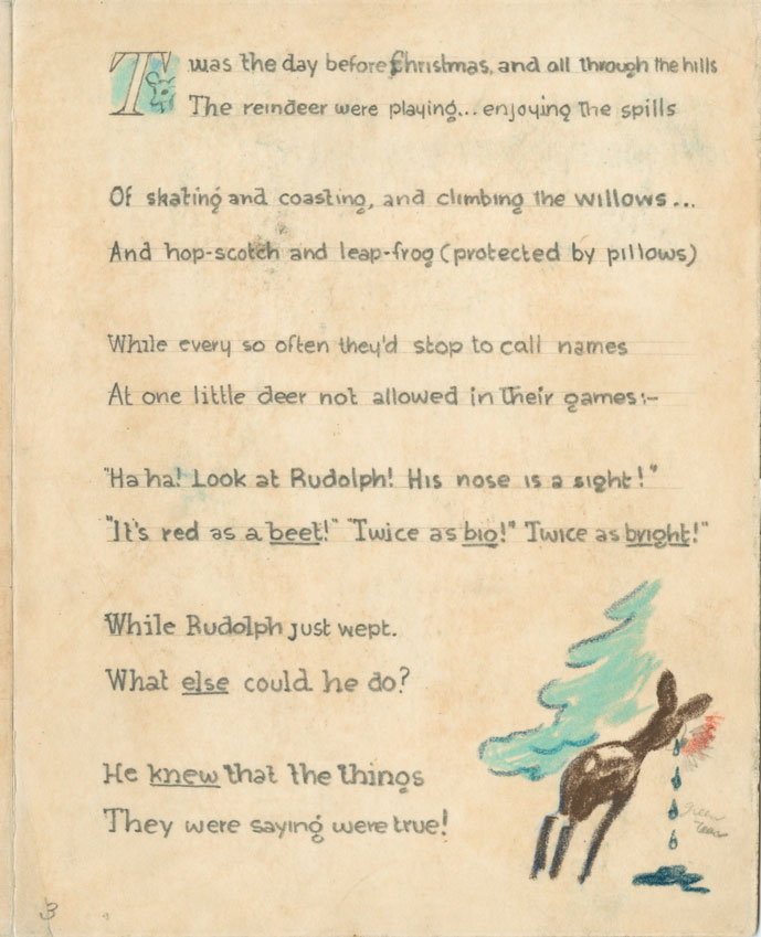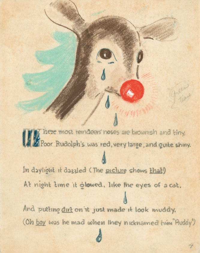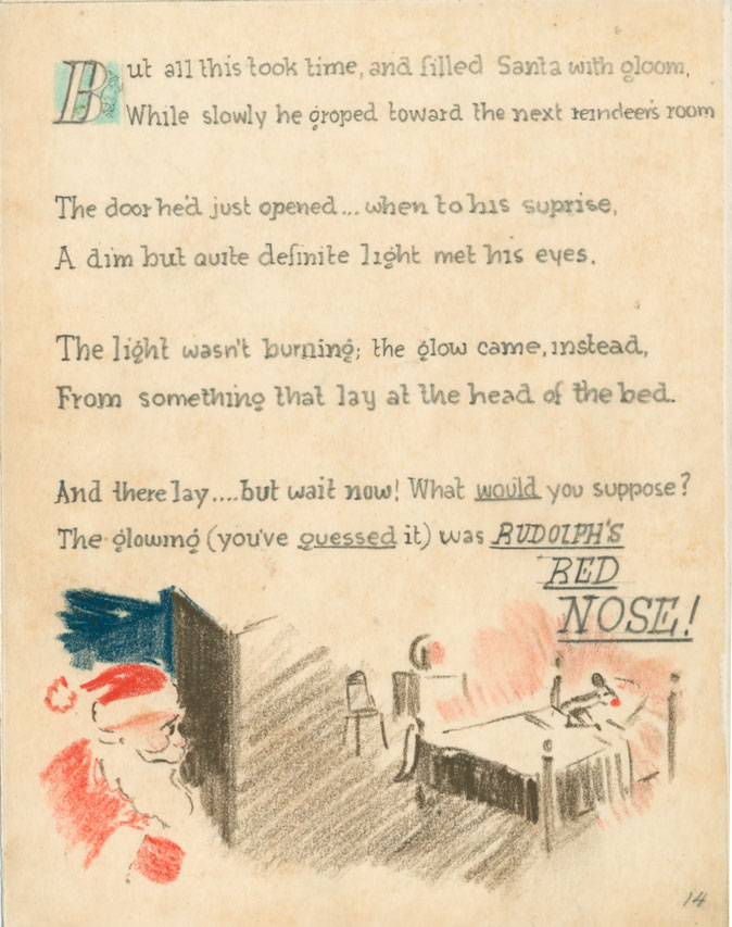 As May worked on “Rudolph the Red-Nosed Reindeer” through the summer, his wife’s health worsened. She passed away in July 1939. Now a widower and a single father, May refused the offer of his boss to give the assignment to someone else. “I needed Rudolph now more than ever,” he later wrote. Burying his grief, May finished the story in August.